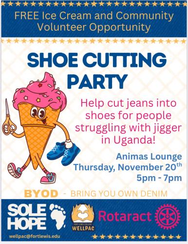 Help us cut jeans into shoes for people in Uganda! Bring an old pair, or use one of ours! Meet in the Animas Lounge this Thursday, November 20th 5-7pm